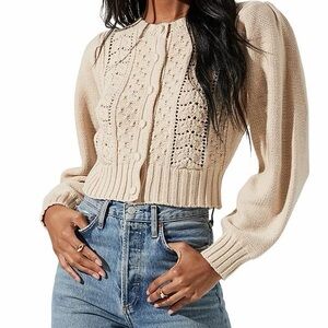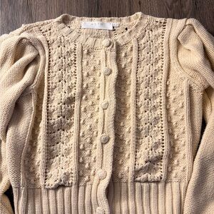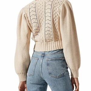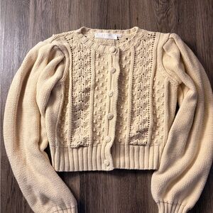 Cropped cardigan with crochet and cable knit panels. Button-front closure with covered buttons. Balloon sleeves and ribbed hem. Soft ivory neutral for easy layering.