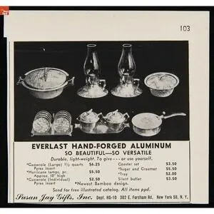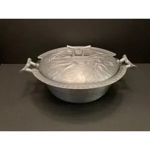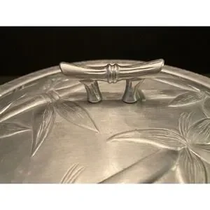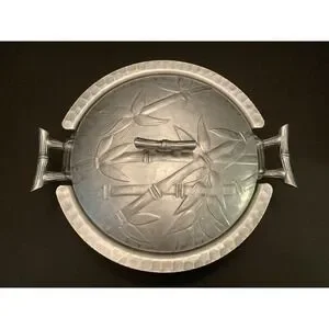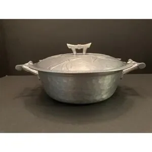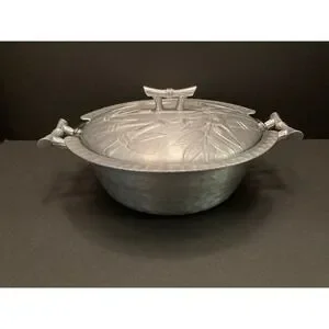 Complete "Bamboo Bali" Casserole from Everlast. Made of forged aluminum with a brushed surface, it features a mid century Asian vibe that was all the rage after World War II. Everlast started manufacturing this piece as part of their Bamboo Bali set starting in 1948 and kept making it through 1959. I included a photo of their catalog from the 1948-49 line that features this same casserole. The openings in the lid to accommodate the handles are smaller on this one than on other models. Notice that the aluminum is brushed and not shiny. The original piece is also brushed. I did not scrub or polish this item as to not rid it of its original finish.