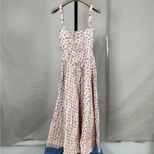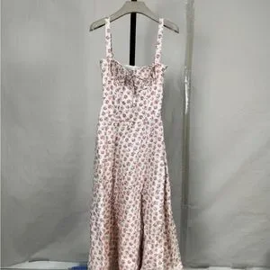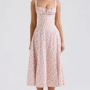 A feminine pink floral midi dress with a fitted bodice and sweetheart neckline. Lightweight fabric and adjustable straps provide comfortable wear. Flared skirt creates a flattering silhouette for day or evening outings.