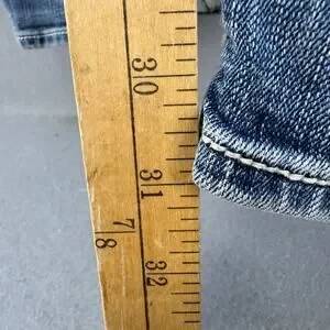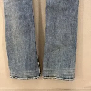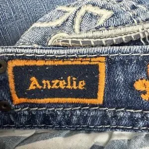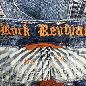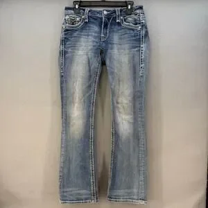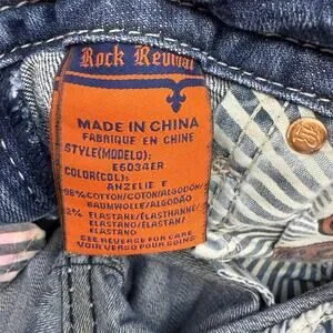 Rock Revival Women's Denim Jeans. Blue in color. Medium denim wash. Tagged size 27 (4). These women's Rock Revival Anzelie jeans feature a five pocket design with embellished rear pockets and faux pocket flaps, a boot cut leg and a mid to low rise fit. Style number E6034ER. In preowned condition with minimal signs of wear (see photos for heel drag and slight blemishes).