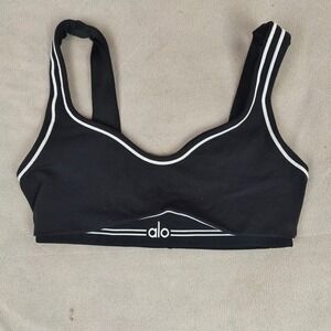 Alo Yoga sports bra in black with white contrast piping and a graphic logo band. This performance piece features a scoop neckline and a low scoop back, designed with wide straps for comfort and stability during low to medium-impact activities. The moisture-wicking fabric and four-way stretch ensure a flexible fit that moves with you, while the minimalist aesthetic makes it a versatile addition to any activewear collection.