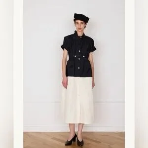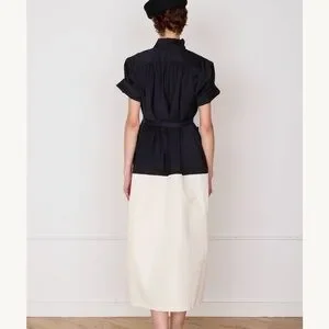 The Maren Dress is a two-tone button-front midi with a relaxed silhouette and subtle gathers at the shoulders for soft volume. Designed with short sleeves, a stand collar, and front patch pockets, it’s finished with a removable belt to define the waist or wear loose for an easier shape. Made in black wool suiting and cream cotton taffeta.