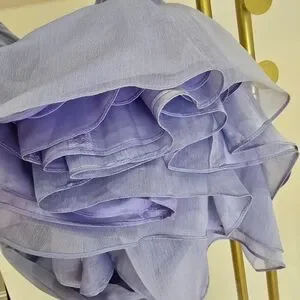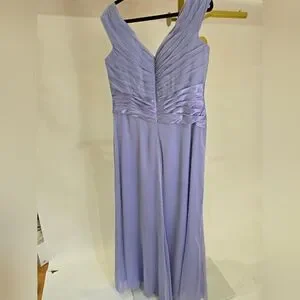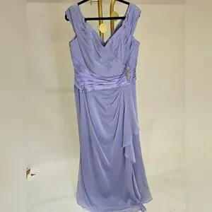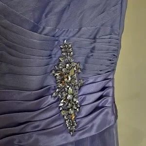 Beautiful lilac lavender dress with elegant draping. Features a sparkling embellishment.