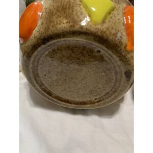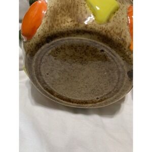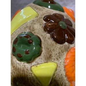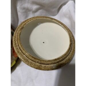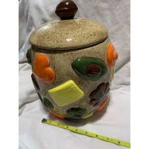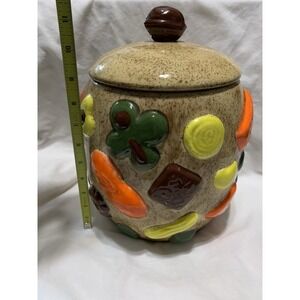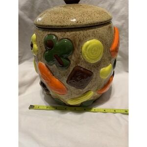 This 1950s Vintage Cookies All Over Cookie Jar is a charming addition to any kitchen or home collection. Handmade with a vintage retro style, this large round jar features a geometric pattern and brown color. The walnut handle lid sits on top of the jar, making it easy to clean and perfect for storing your favorite cookies. With a diameter of approximately 8 inches and a height of 8.75 inches, this ceramic and porcelain cookie jar is a unique and nostalgic piece from the 1950s that will surely delight teens and adult collectors alike.