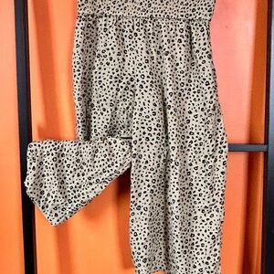 Lightweight wide leg culotte pants with an elastic waistband. Allover tan fabric with black leopard spots. Flowy, casual style perfect for everyday wear.