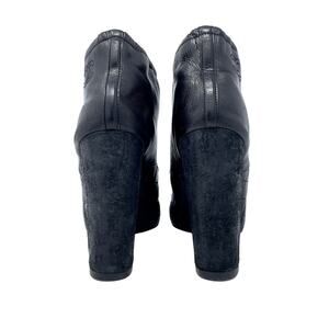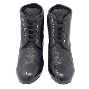 AUTHENTIC Chanel Womens Shoes Ankle Booties CC Logo Quilted Black Lambskin & Patent Leather Distressed Suede Cap Toe Lace-Up Heeled