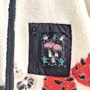 New with tags MARKET sherpa fleece jacket featuring a colorful mushroom / forest motif. Made from 100% polyester fleece with a soft, plush texture. Cream/off-white base with black full-zip closure, black trim, and a chest pocket with embroidered detail. Warm, cozy, and easy to layer.
