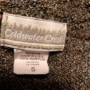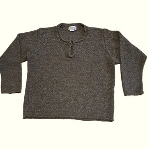 Soft knit crewneck sweater by Coldwater Creek. Subtle heathered texture for a classic look. Simple button-tab detail at the neckline. Relaxed fit with long sleeves. Versatile neutral for layering.