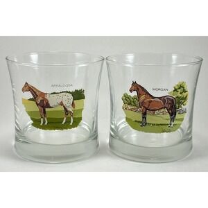 One glass features an Appaloosa and the other a Morgan breed horse. Glasses seem to be in good condition. No chips or cracks.