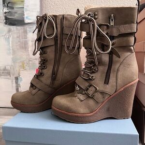 This lace-up w/zipper opening boot is from Aldo’s. Features a faux fur lining, wedge heel, and buckle detail that can also adjust fit.