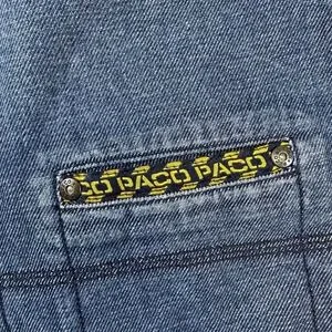 Color and pattern: Medium blue wash with tonal stitching and contrast yellow logo accents.