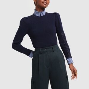 Goop G. LABEL 100% Cashmere Puff Sleeve Crewneck Sweater in Navy Blue