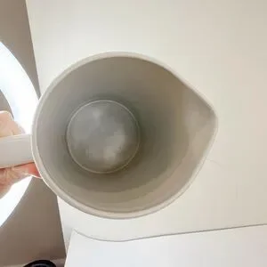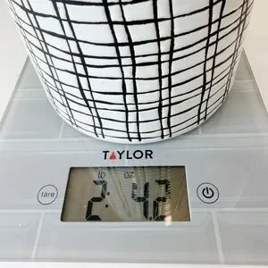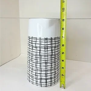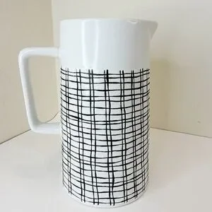 Beautiful off white with black textured cross hatch design stoneware pitcher. Squared handle.