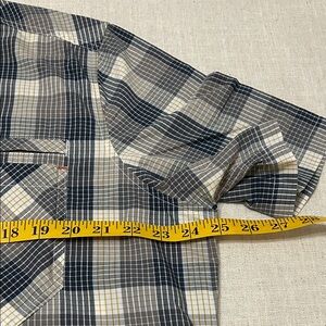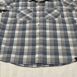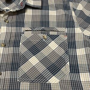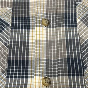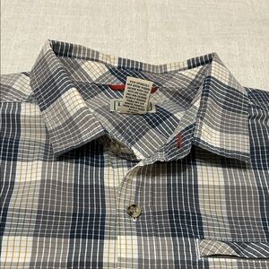 LLBean men’s comfort stretch button down in blue/grey with orange accents. In excellent condition. Perfect for hikes on the weekend or casual wear at work.
