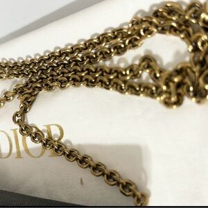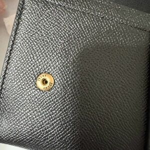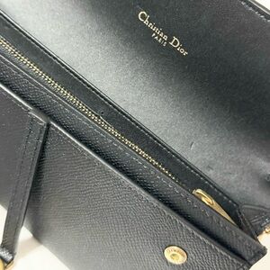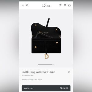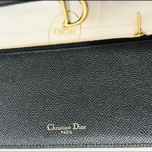 Sleek black leather crossbody with a gold-tone chain strap. Curved flap and D charm detail on front. Includes coordinating black pouch. Polished gold hardware adds luxe contrast.