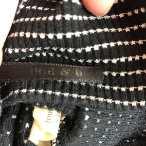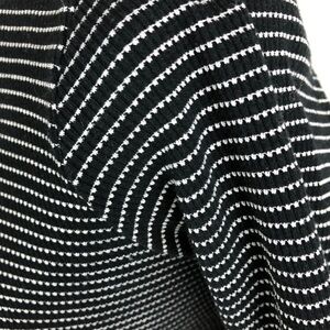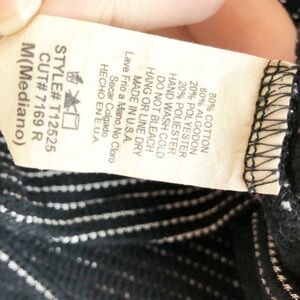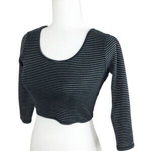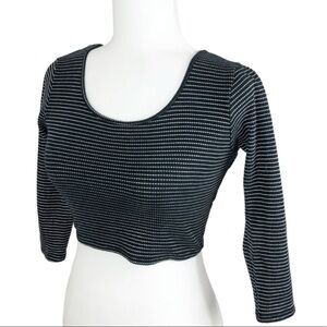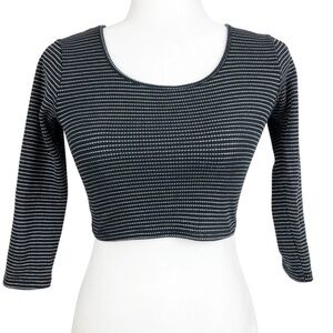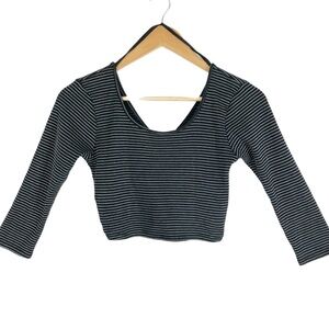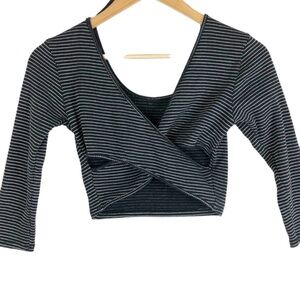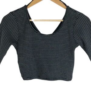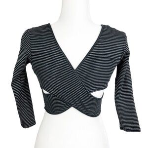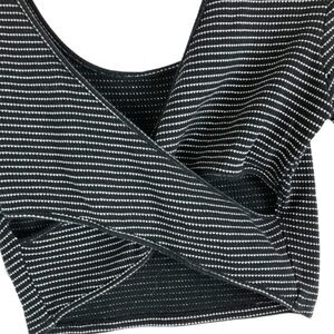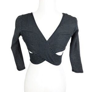 Black and white striped cropped wrap long sleeve top. This top features a scoop neckline on the front and a distinctive criss-cross wrap design on the back with cut-out details at the waist. The sleeves are three-quarter length. Brand tag rubbed off. Size M. Style No: T12525. Cut: 7169R. 80% Cotton, 20% Polyester. Hand wash cold. Made in US.