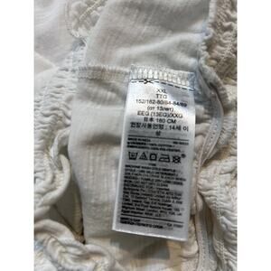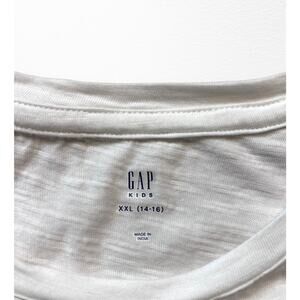 White sleeveless top from Gap in size XXL (14/16). IMO runs on the small side, fits similar to a 13/14. In great condition- purchased NWT and my daughter wore it exactly one time. The body of the shirt is 100% cotton and the eyelet ruffles are 100% polyester. Smocked waist.