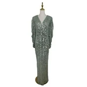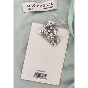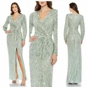 Mac Duggal 5638 Seafoam Green Sequins High Slit Bishop Sleeve Gown Size 12 $598