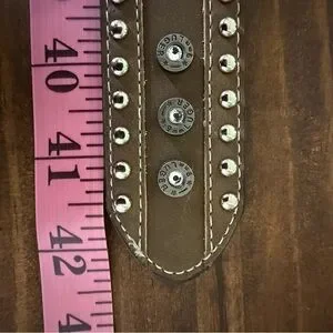 Stylish brown belt featuring (9mm Luger) silver studs and an ornate silver buckle. Perfect for adding a touch of flair to any outfit.