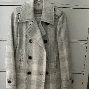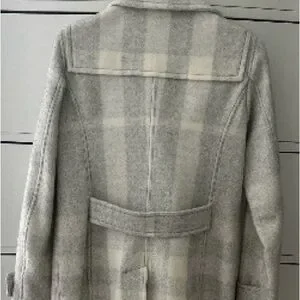 Burberry pea coat in a soft light gray plaid. Double-breasted front with dark buttons. Structured notch collar and tailored seams. Classic silhouette for polished layering. Great Condition , please ask questions 😊