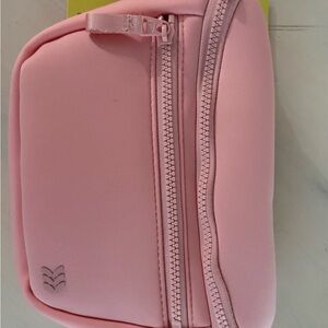 Soft peach cosmetic pouch with dual zip pockets. Smooth, water-resistant exterior. Minimal logo accent for subtle style. Lightweight and easy to carry.