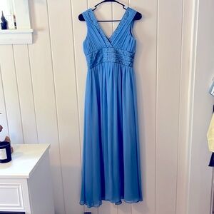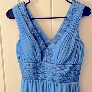 DAVIDS BRIDAL Blue Grecian Sleeveless V Neck Embroidered Midi Prom Dress 4 NWOT