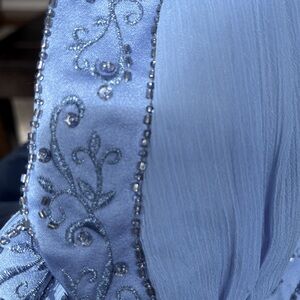 This elegant blue sleeveless beaded Grecian style v-neck midi prom dress is perfect for any occasion. Dress could be considered a maxi dress it just doesn’t touch the floor. Material is a crepe chiffon, plenty of flare. Its classic design and comfortable fit make it a must-have in your wardrobe. Dress zipper under the armpit. 100% polyester. Size 4.