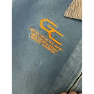 A robust Carhartt work jacket, a symbol of durable craftsmanship. This piece showcases a classic blue wash with intentional distressing, adding to its authentic, lived-in character. Prominently featured is embroidered branding for General Construction Company, enhancing its unique workwear appeal. The jacket includes practical features like a zippered front closure, dual chest pockets, and welt hand pockets.