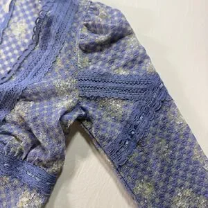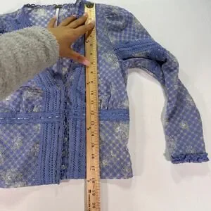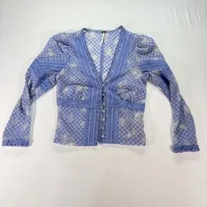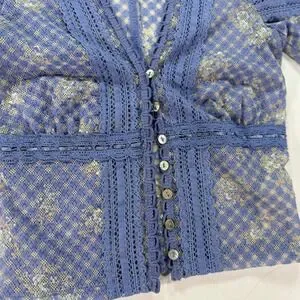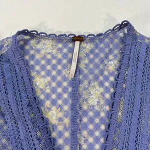Free People Gingham Floral Lace Cardigan Top Women's XS Blue Sheer Boho V-Neck