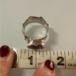 Own a piece of wearable art with this authentic signed Arya Design statement ring. This artisan-crafted piece is a masterclass in texture and color. It features a wide, hammered sterling silver band framed by a central gold-tone accent band.