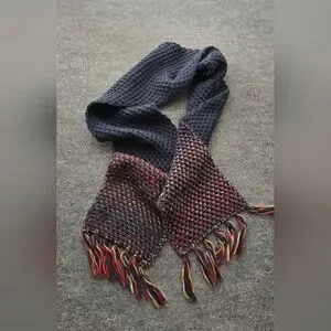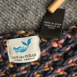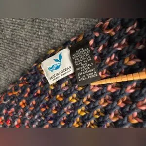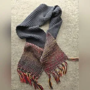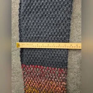 Save the ocean scarf with Space Dye detail and fringe at the end, Approximately 78 inches long. This chunky knit scarf with tassel details would be the perfect companion on any chilly autum walk. The navy contrasts well with the colourful pattern, and due to the dying processs each scarf is ever so slightly different. The super soft fabric makes wearing it a dream. Team it with the a hat and mittens to complete the look. Pre-loved and in excellent condition. Reach out if you have any questions. Please see pictures for measurements and condition.
