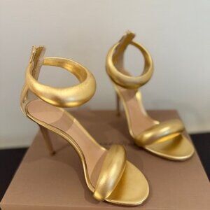 Gianvito Rossi's 'BIJOUX' sandals are defined by statement 'bubble' straps. They've been handcrafted in Italy from glossy gold leather and rest on 105mm stiletto heels. The zippers make them easy to slip off at the end of the evening. Brand new. These gold shoes are perfect for evenings out or black tie events. Still full retail in stores at $995. These come with the box, dust bag, and mini dust bag with extra heel caps. These were worn only once for 5 minutes for a photo shoot.