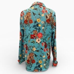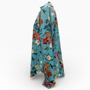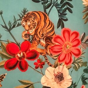 BlackMilk button down shirt features a vibrant teal blue background adorned with a lush botanical print of tigers and tropical flowers. Designed and made in Australia, this piece offers a structured yet comfortable fit with a classic pointed collar and long sleeves with buttoned cuffs. The intricate graphic design showcases detailed tigers amidst red and yellow blossoms, creating a bold, maximalist aesthetic perfect for making a statement.