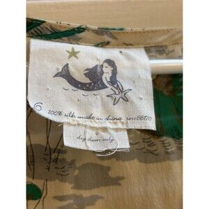 This is a preowned Anthropologie silk blouse from their Mermaid label line. It features a delicate v-neckline and fluttery cap sleeves, set against a light tan background. The print mimics the look of a vintage field guide or botanical sketch. The lightweight silk, V-neckline, and flutter cap sleeves create a soft, airy vibe reminiscent of Cottagecore or a bohemian light aesthetic. This specific in-house line from Anthropologie was active during the early-to-mid 2000s.