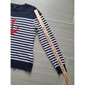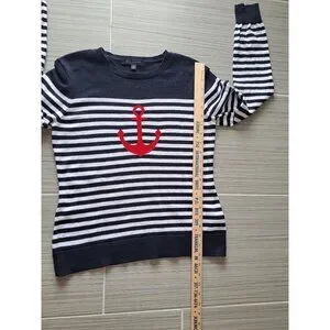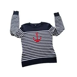 This sweater offers a classic nautical style with a bold red anchor design on navy and white stripes. Ideal for casual or semi-casual occasions.