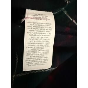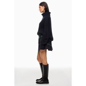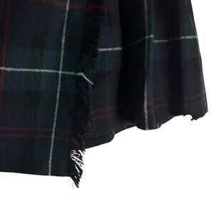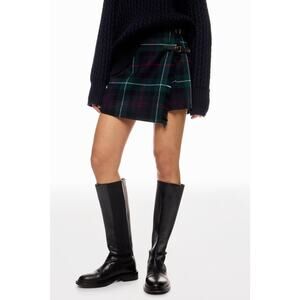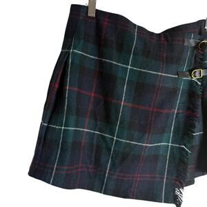 Polo by Ralph Lauren mini skirt in a dark plaid. Features green and navy tartan with subtle blue and red accents. Wrap-style silhouette with buckle detail. Polished and preppy look. Easy to pair with boots or sweaters.