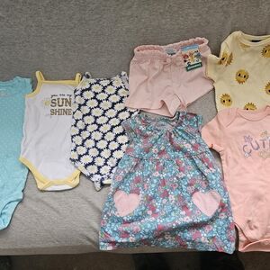 Cute floral dress with heart pockets in blue and pink. Includes assorted spring onesies and shorts in pink, yellow, white and daisy print. Bright, playful colors. Soft cotton styles perfect for everyday wear.