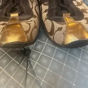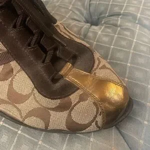 Stylish Coach sneakers with signature pattern. Features brown and gold accents. Comfortable and chic design. Reposhed from another posher. Only wore twice. Comfortable and stylish but ready to pass them onto their new home. See pics for minor flaws. Soles are starting to separate from shoe. A super glue would probably fix this. Hence the lower price.
