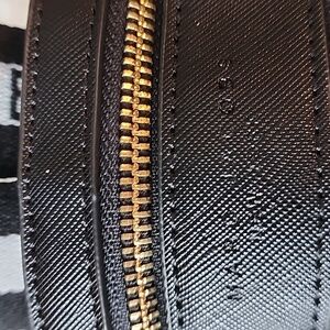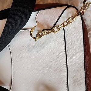 Stylish Marc Jacobs mini backpack in white with black accents. Features gold hardware and signature logo detail. Adjustable logo-printed straps for comfortable wear. Sleek, versatile design perfect for everyday use. Used Gently “Backpack with two zippered compartments. All zippers work properly; they may just need a little lubrication so they open and close more smoothly.”