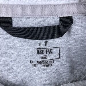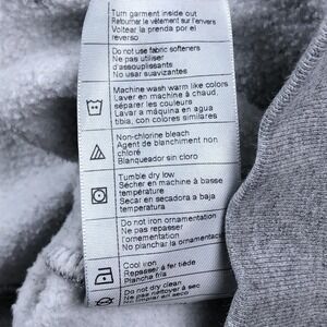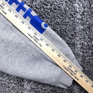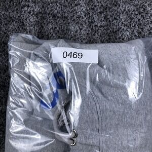 Hoodie is pre-owned with cotton-blend fleece fabric showing light wash wear and softening from normal use and laundering. Ribbed cuffs and hem, hood drawcord, sleeve graphic print, and front kangaroo pocket are intact and functional with fabric clean and free of holes, fraying, or stains. Garment is stored folded inside a clear protective poly bag to help maintain cleanliness during storage.