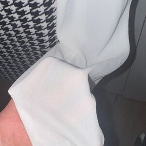 Chic houndstooth pattern. Elegant tie-neck detail. Long sleeves with contrast cuffs.