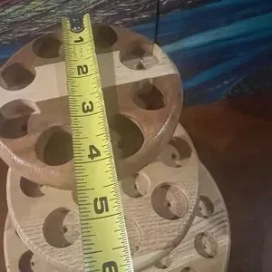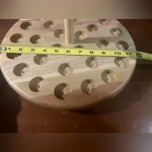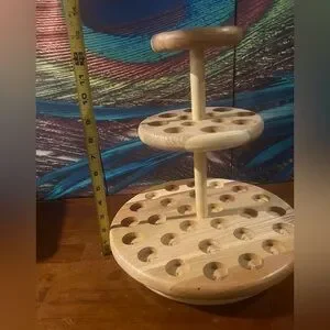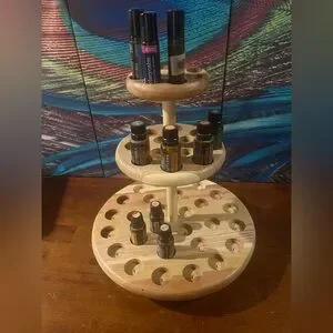 Hand carved wooden essential oil holder with multiple tiers. Perfect for organizing your collection. Lazy Susan base. See photos for measurements. Holds 48 EO bottles. Regular size and thinner holes for rollerballs. Can be stained or painted to match decor. Great for DoTerra and Young Living displays or homemade blends.