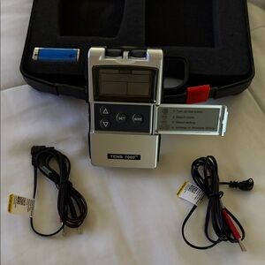 TENS 7000 unit in a black case. Includes electrodes and manual.