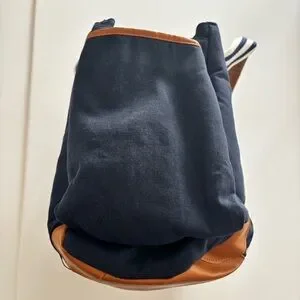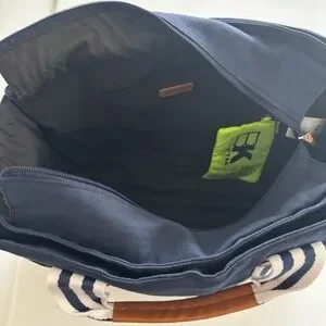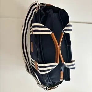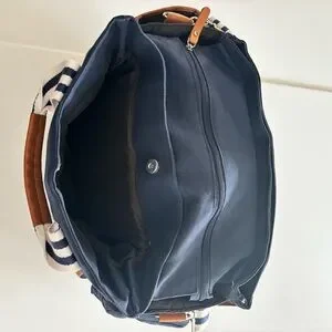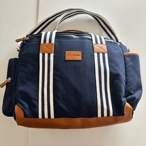 Stylish and functional Baby K’tan diaper bag in classic navy canvas with striped handles and leather trim accents.