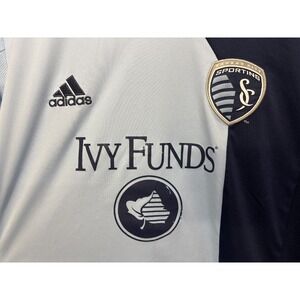 The product is a 2013 Sporting Kansas City MLS Adidas soccer jersey in a two-tone blue color. It is officially licensed by Major League Soccer and features the team's name and logo. The jersey is designed for men in size large and is made with Climacool technology to keep athletes cool and dry during play. This fan apparel is a great souvenir for supporters of Sporting Kansas City and fans of soccer in general. Made in Vietnam, this jersey showcases the team's colors and represents the brand's commitment to quality and performance on the field.