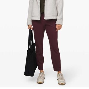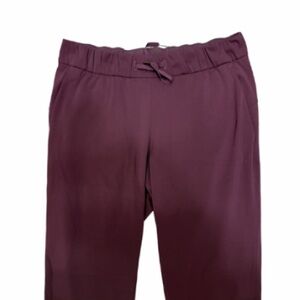 Lululemon On the Fly Pants, likely in the color Cassis or Dark Adobe, featuring a drawstring waistband and tapered leg for a versatile, comfortable fit. Size 10. Very good condition.