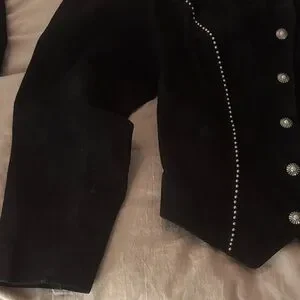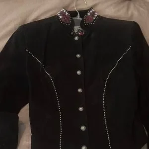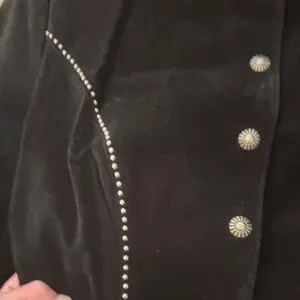 Chic black blazer with studded details. Features a unique patterned collar. Ideal for stylish occasions.