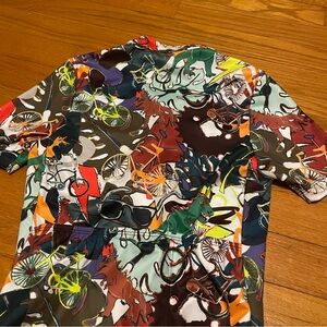 Pearl Izumi short-sleeve kid’s small cycling jersey with bold multicolor graphic pop art print. Breathable, quick-dry fabric designed for active comfort. Zip-front placket for ventilation and easy layering. Eye-catching green and blue accents add sporty style. Pockets on back for water bottles, etc. excellent pre-owned condition.