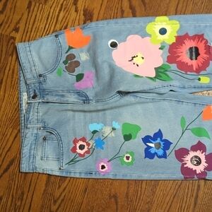 Flower Power retro baggy straight leg hi rise painted denim jeans W29 L29