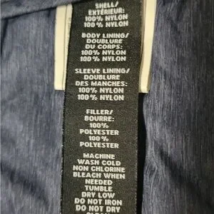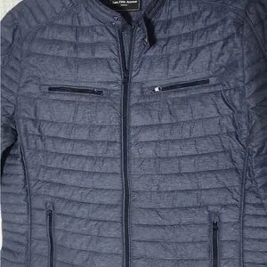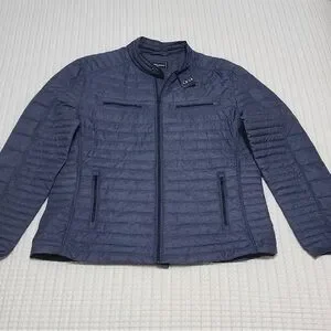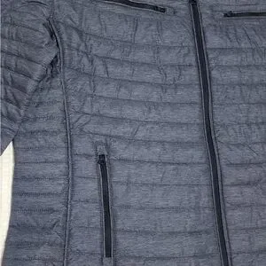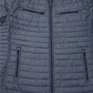 Navy quilted jacket with zip closure. Features chest and side pockets. Ideal for layering.
